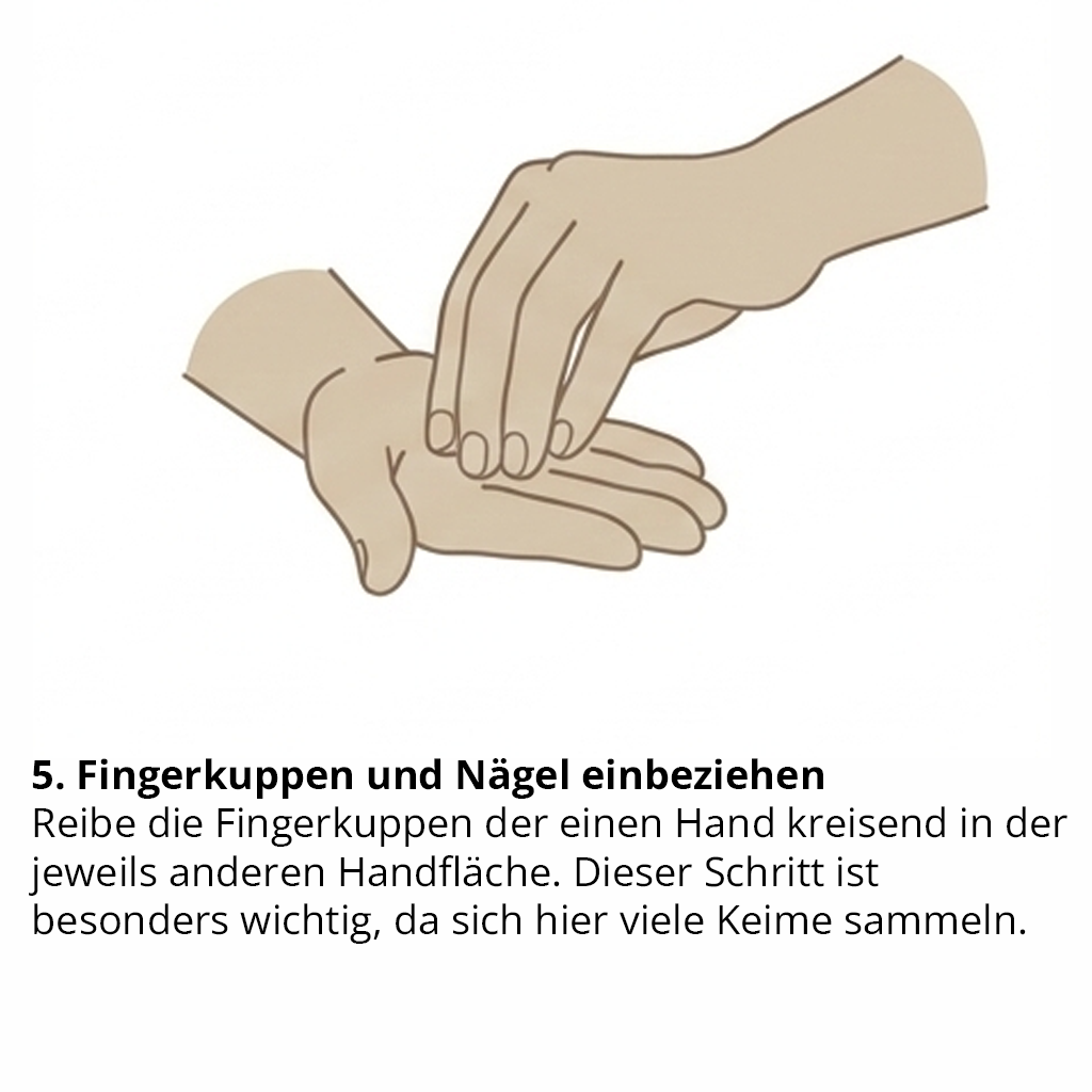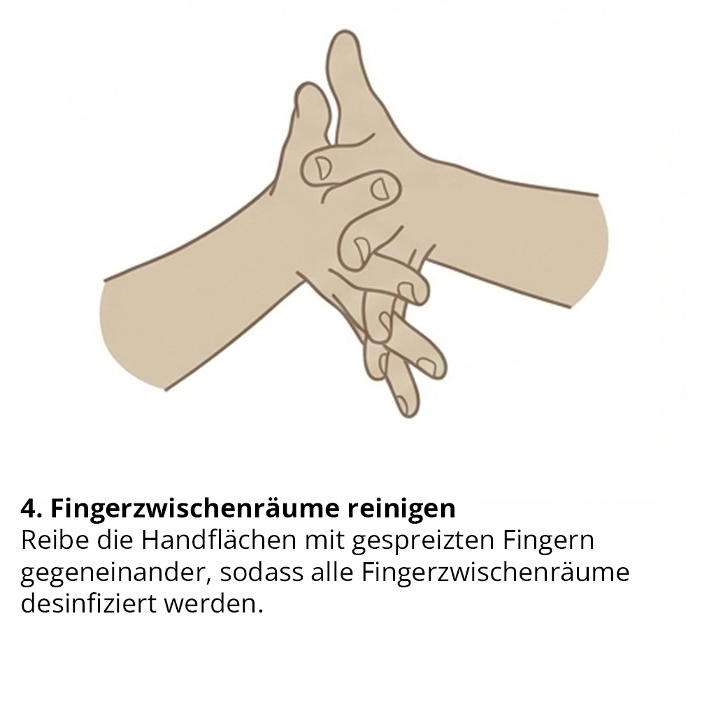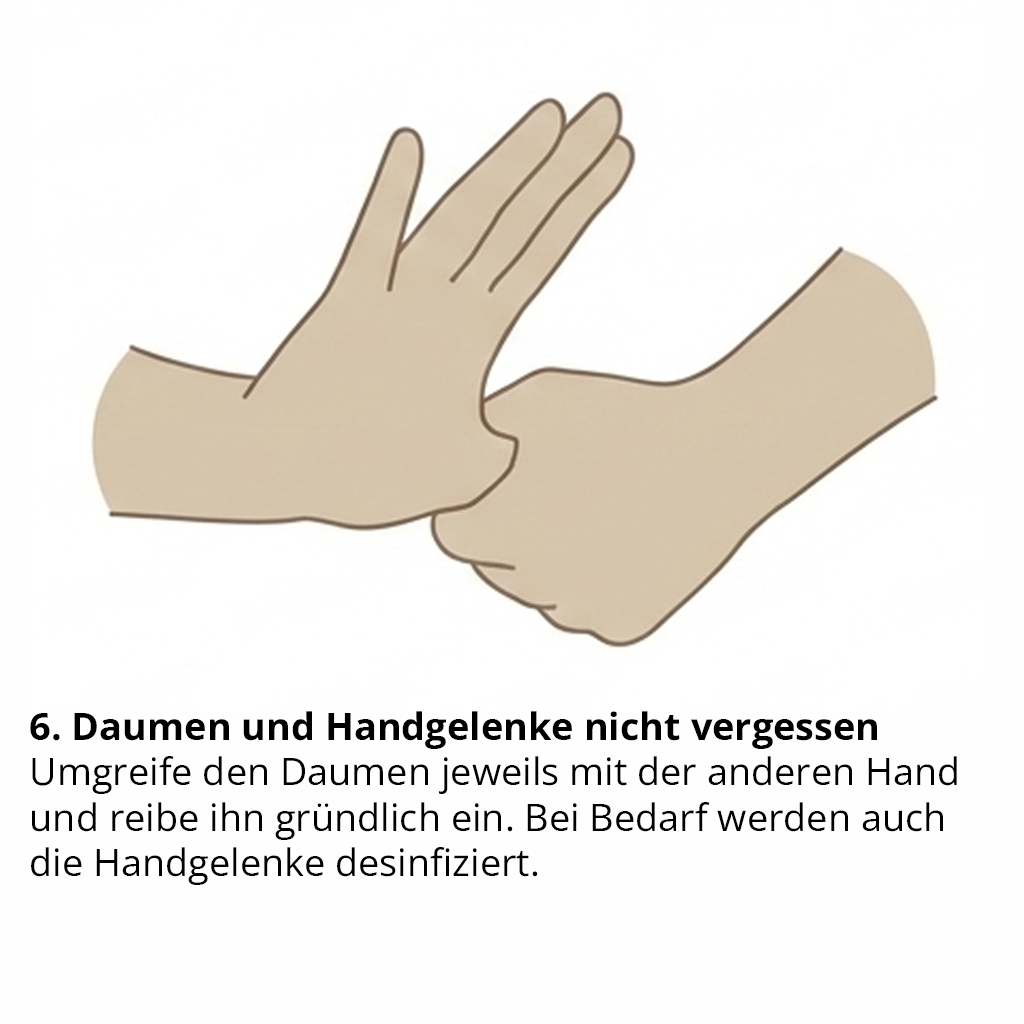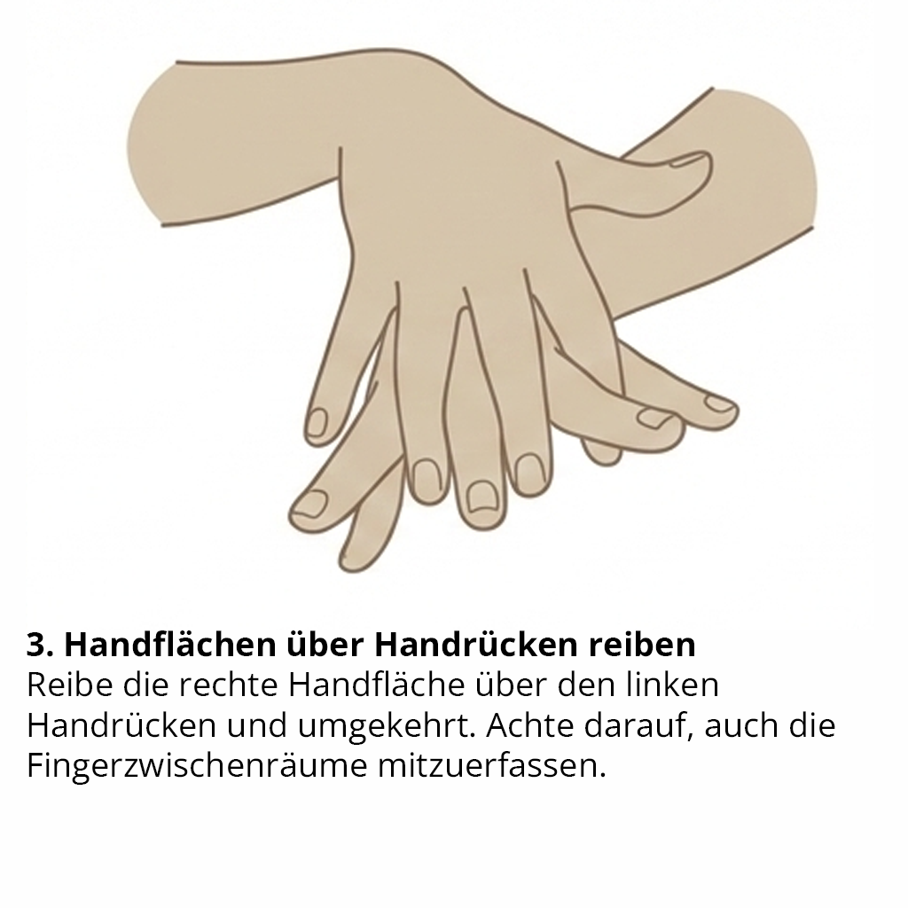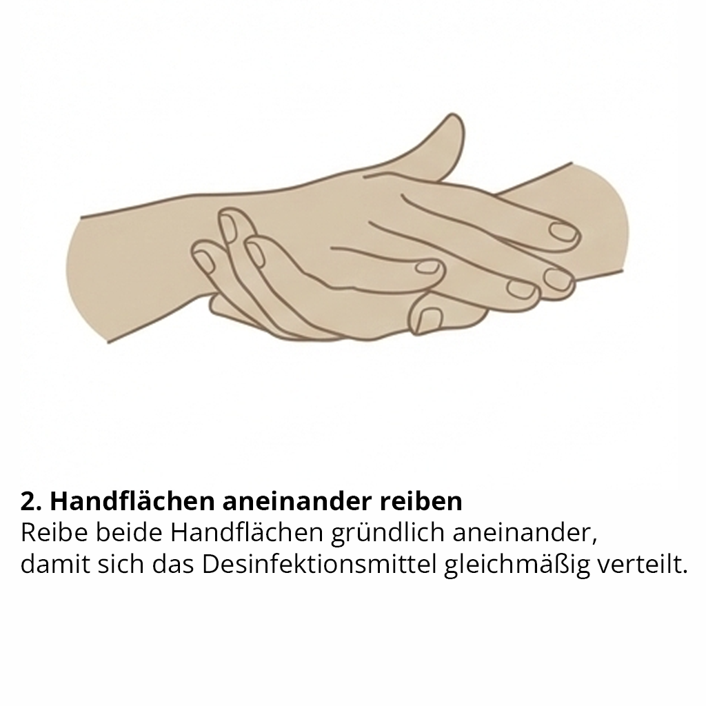 Wichtig: Die gesamte Händedesinfektion dauert mindestens 30 Sekunden. Die Hände dürfen währenddessen nicht abgetrocknet werden, sondern müssen vollständig trocknen. Nur wenn alle Bereiche der Hände benetzt sind und die Einwirkzeit eingehalten wird, ist die Händedesinfektion wirksam.